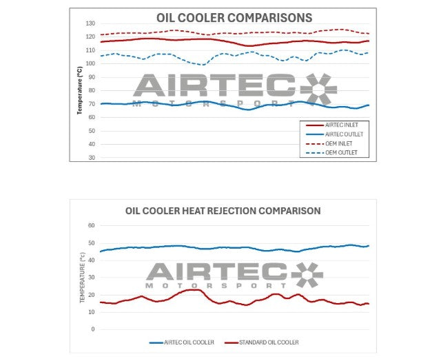 On average, the temperature decrease by the AIRTEC Motorsport oil cooler was double that of the original oil cooler.