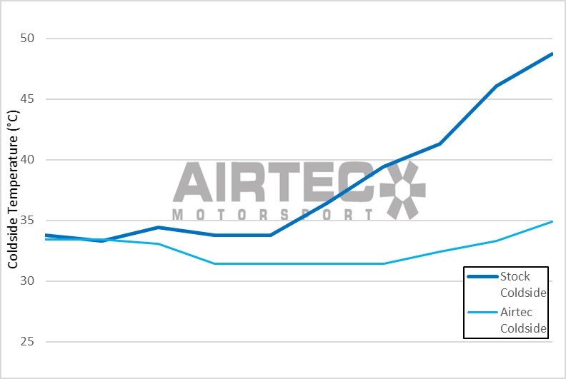 Making the most of the room behind the front bumper, our increased core size allows 40% more volume than the standard intercooler, which allows consistent cold side temperatures on back to back runs rising between 3-5°C in comparison to the stock 15°C+. Typical gains of between 8-12bhp are seen on a Stage 1 car with these results.