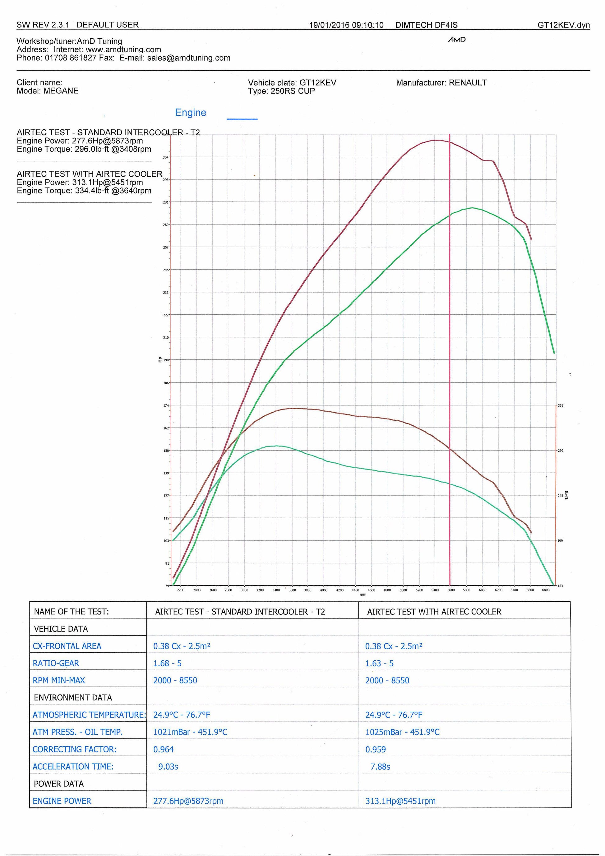 Test Results – The Stage 2 AIRTEC Motorsport intercooler gained 36bhp and 38.4lbft torque against the stock Renault intercooler